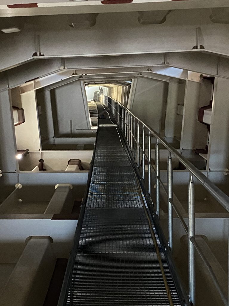 Blick in das Innere des Stahlhohlkastens in Fahrtrichtung Kronach. Hier werden die restlichen Beschichtungsarbeiten durchgeführt.