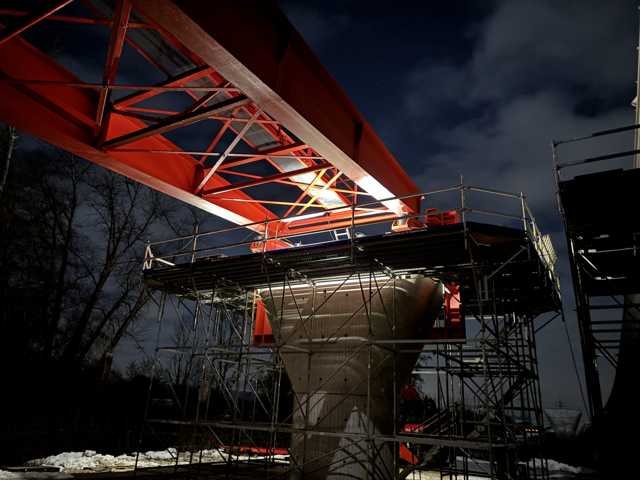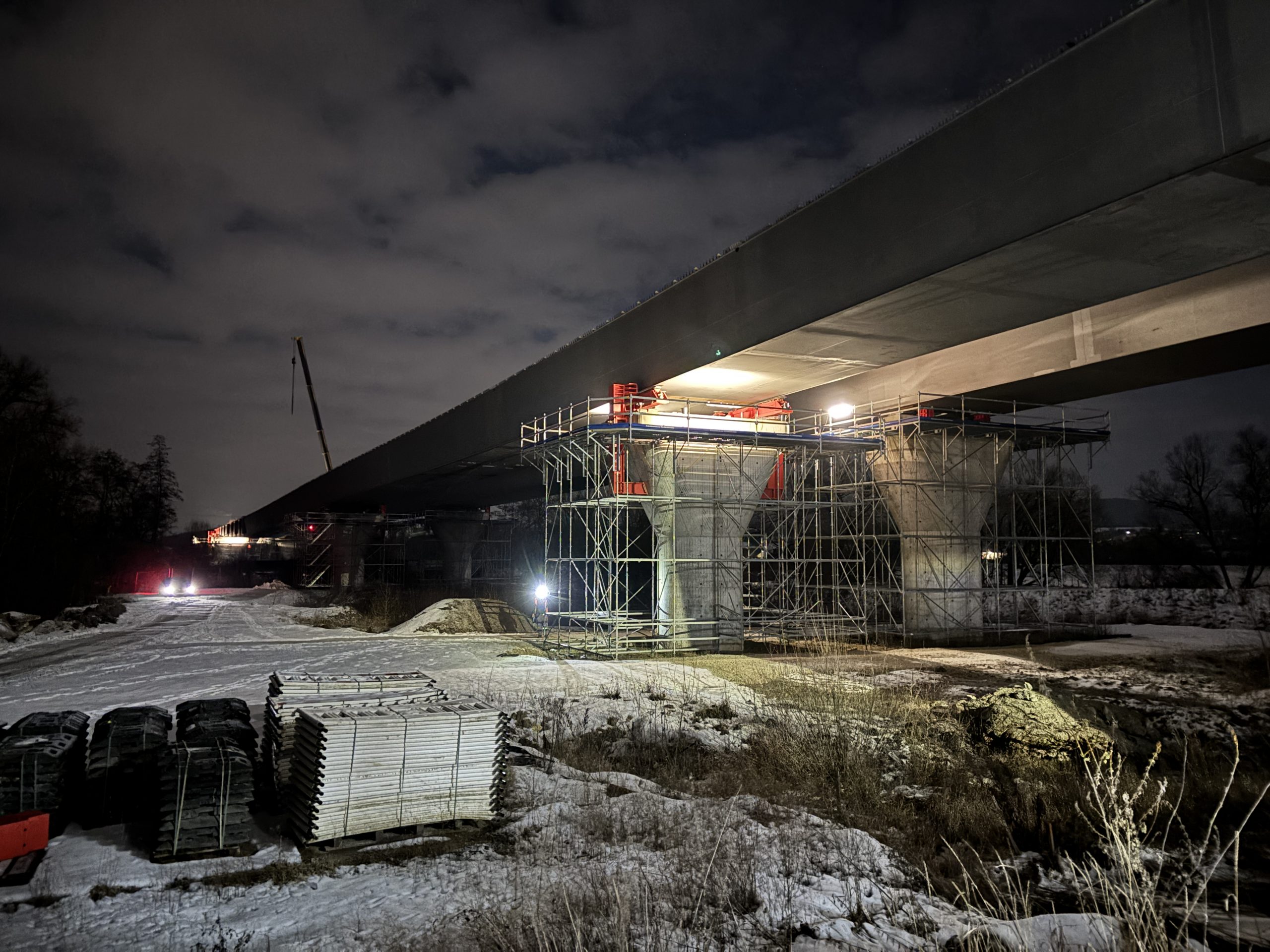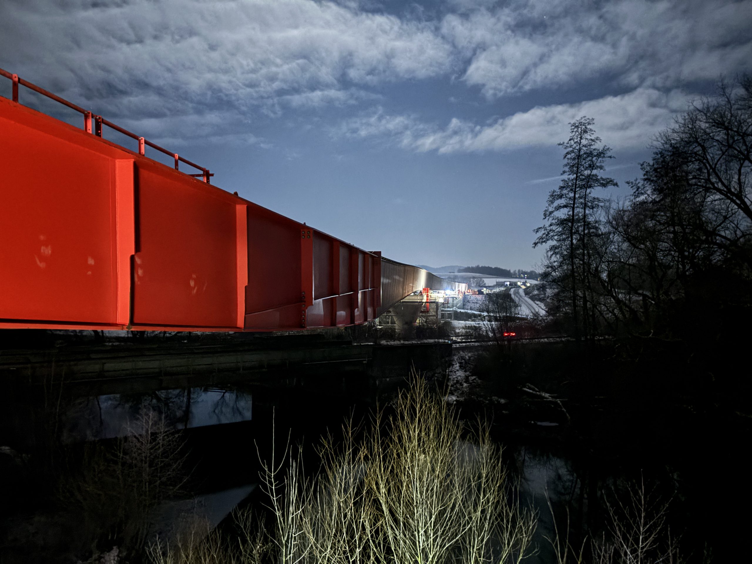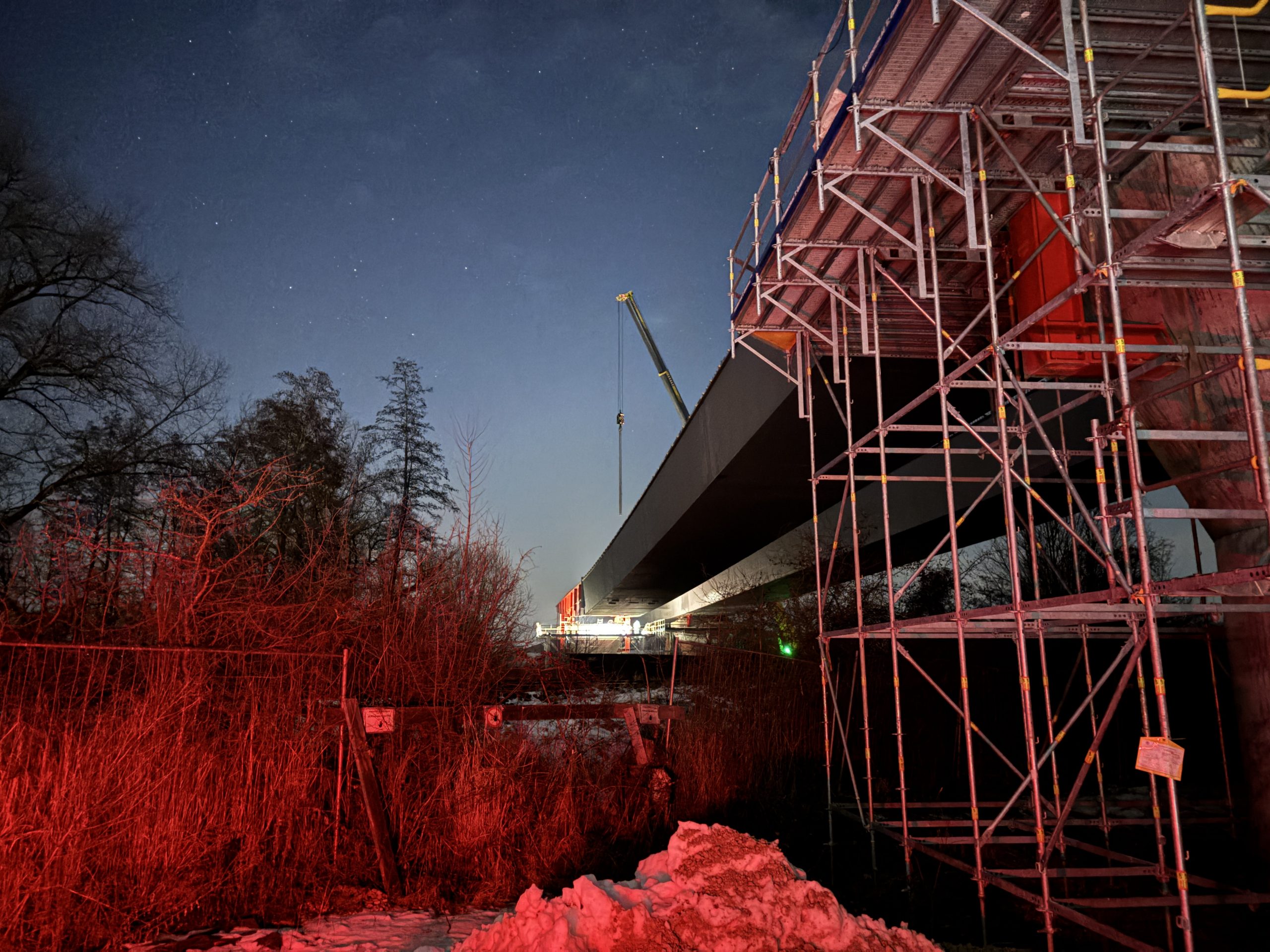 In der Nacht von Dienstag auf Mittwoch wurde nun das ca. 1000 t schwere Brückenstück über die Bahnlinie eingeschoben. Die aktuelle Witterung mit teilweisem Schneefall und Kälte sorgen hierbei für herausfordernde Bedingungen. Da die erforderlichen Sperrpausen der Deutschen Bahn bereits weit im Voraus beantragt und eingeplant werden, kann auf kurzfristigen Schneefall keine Rücksicht genommen werden.