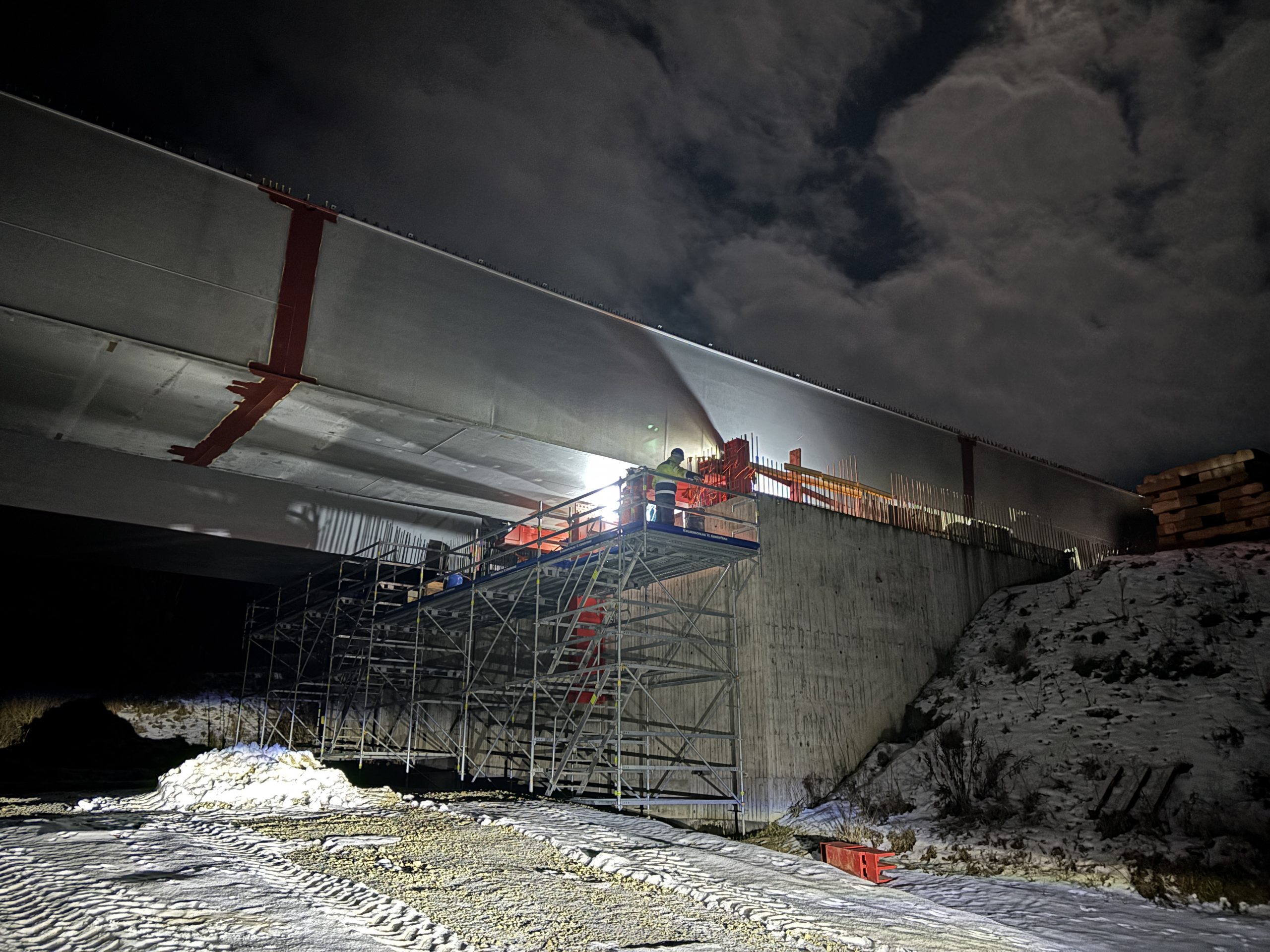 Trotz der herausfordernden Witterung ist der Verschub erfolgreich erfolgt. Der Hohlkasten der Richtungsfahrbahn Lichtenfels wurde dabei um ca. 100m in seine endgültige Lage verschoben. Anschließend wird dann auf die Horber Seite gewechselt. Dort sind die ersten Bauteile aus dem Stahlwerk bereits eingetroffen, sodass die Montage und der Taktverschub von hier aus fortgesetzt werden kann. Verbunden werden können die beiden Teile dann voraussichtlich im Hochsommer.